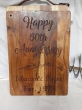 Commercially produced selection of wood cutting boards and charcuterie boards are in stock in the shop. The boards can be laser engraved with any combination of graphics and text. These are perfect for a house-warming gift or for the chef in your family!